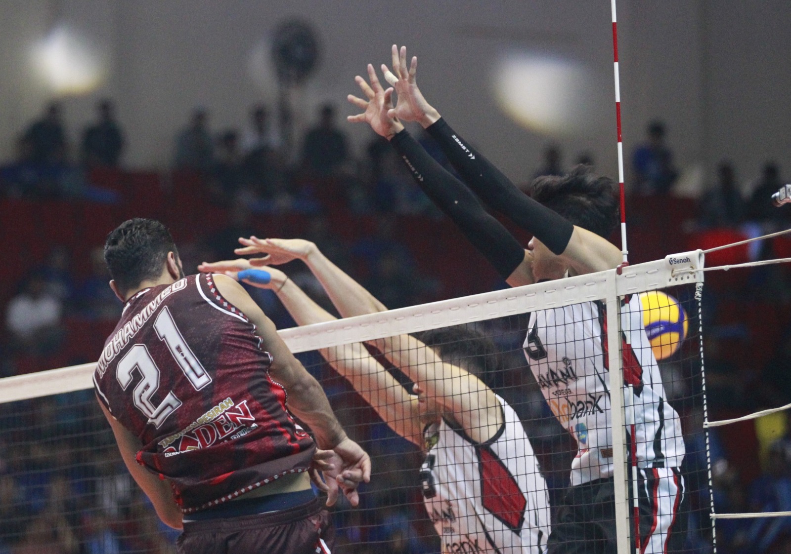 Pemain Jakarta LavAni saat melakukan blok serangan Palembang Bank SumselBabel di duel final four kedua di Semarang -pbvsi-