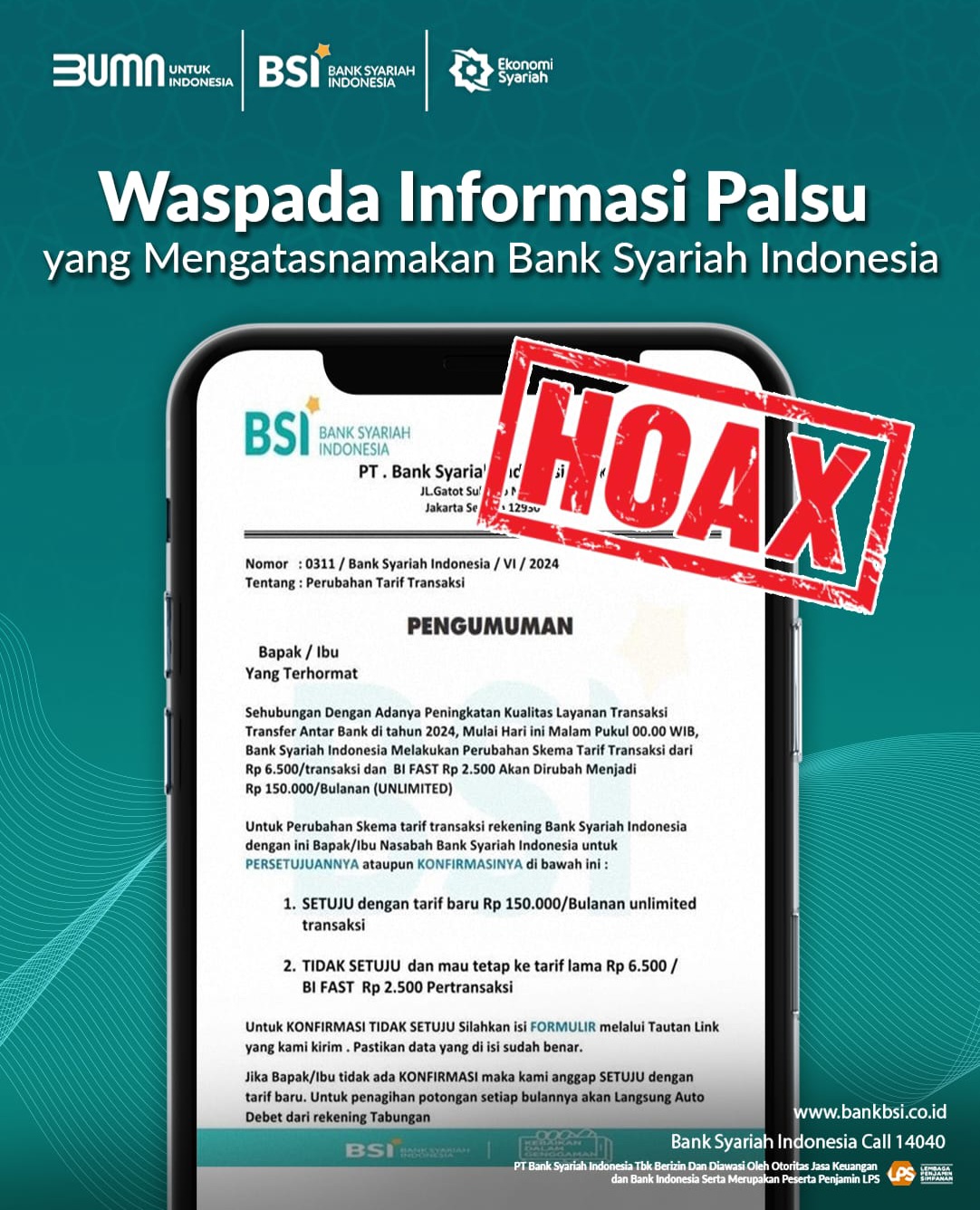 Wisnu menekankan bahwa saat ini tengah marak penipuan hoax tentang informasi Gebyar BSI, perubahan tarif layanan dan juga link-link Whatsapp penipuan dengan APK maupun nomor yang mengatasnamakan BSI.