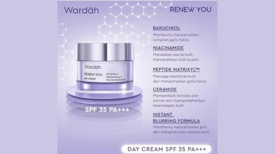 wardah renew you day cream adalah sebuah pelembab dengan tekstur krim yang ringan, dilengkapi dengan spf 35 pa+++ untuk melindungi kulit dari paparan sinar uva/uvb yang dapat menyebabkan tanda-tanda penuaan dini seperti munculnya flek hitam dan garis halus.