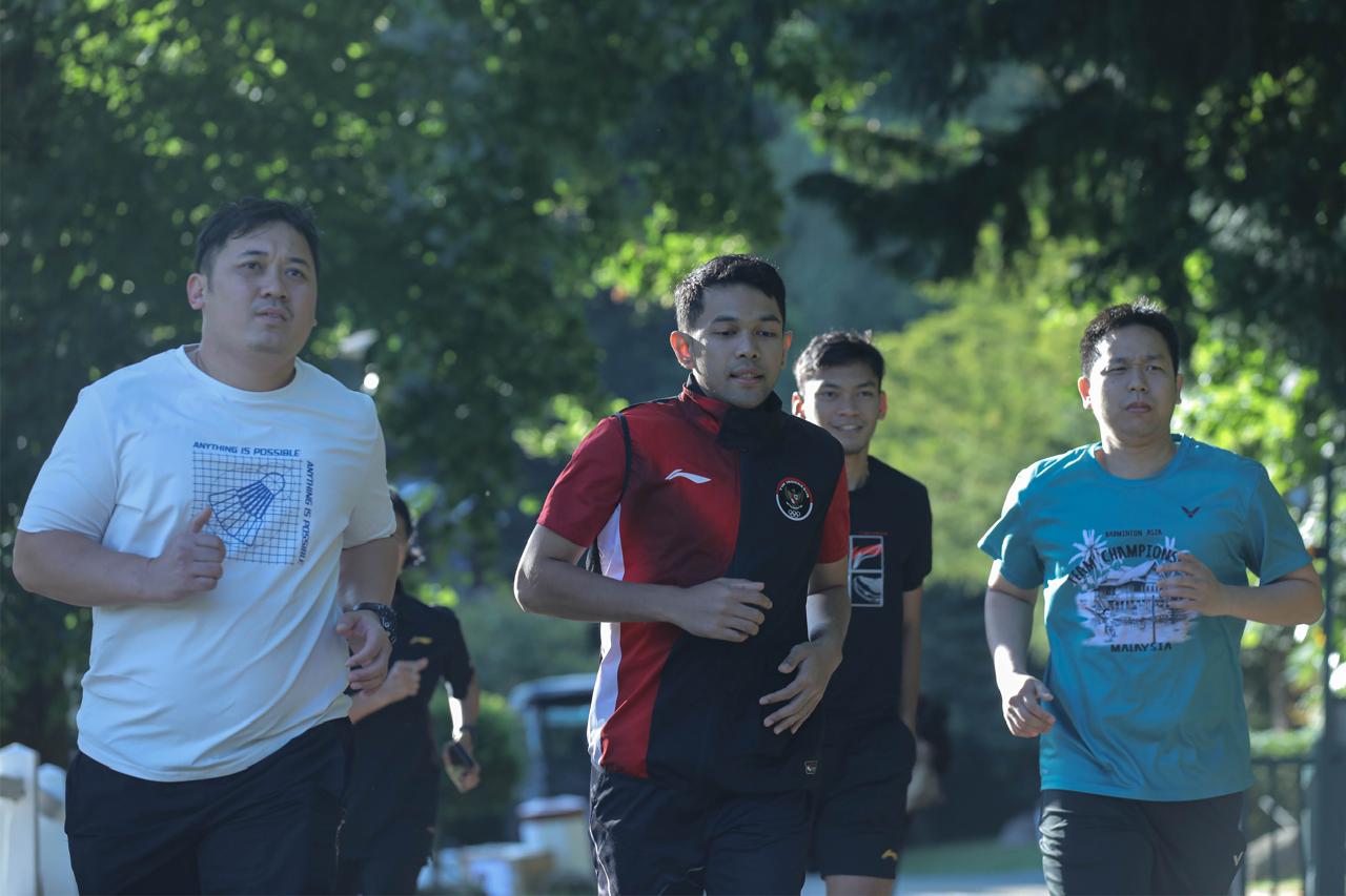 atlet bulu tangkis indonesia saat berlatih fisik dengan jogging di prancis-pbsi-
