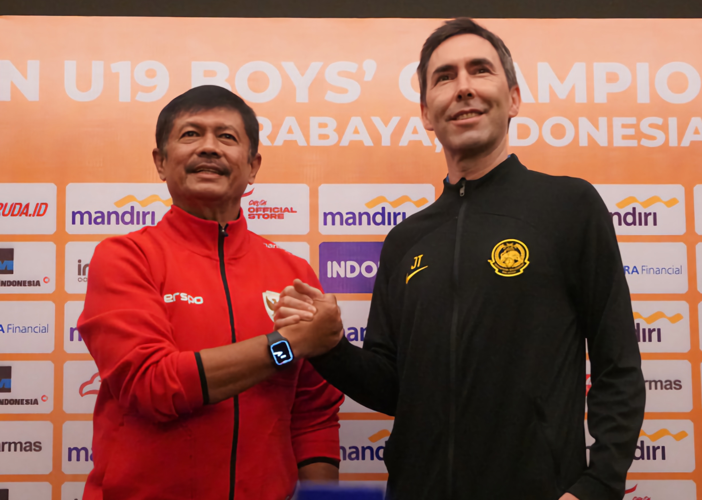 pelatih indra sjafri bersama pelatih tim u-19 malaysia juan torres garrido usai memberikan keterangan kepada media -pssi-