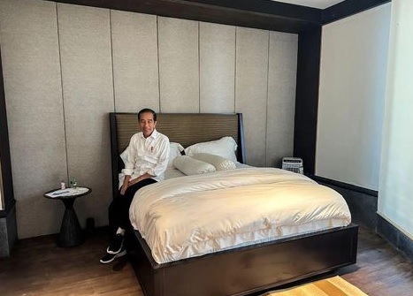 Tampak Jokowi duduk di pinggir kasur yang dilapisi seprai putih.