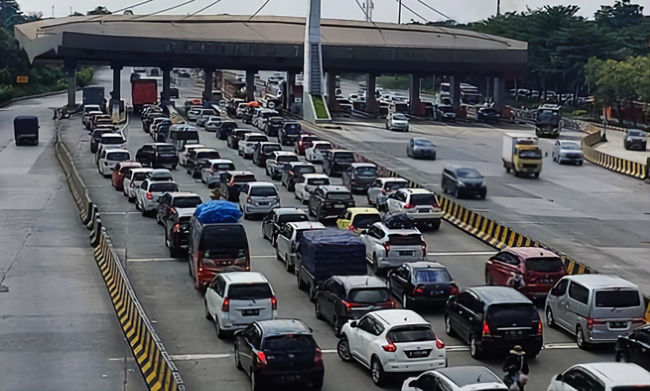 kendaraan saat antre memasuki pintu tol. bulan ini masih ada pemutihan pajak kendaraan bermotor di beberapa daerah. -humas polri-