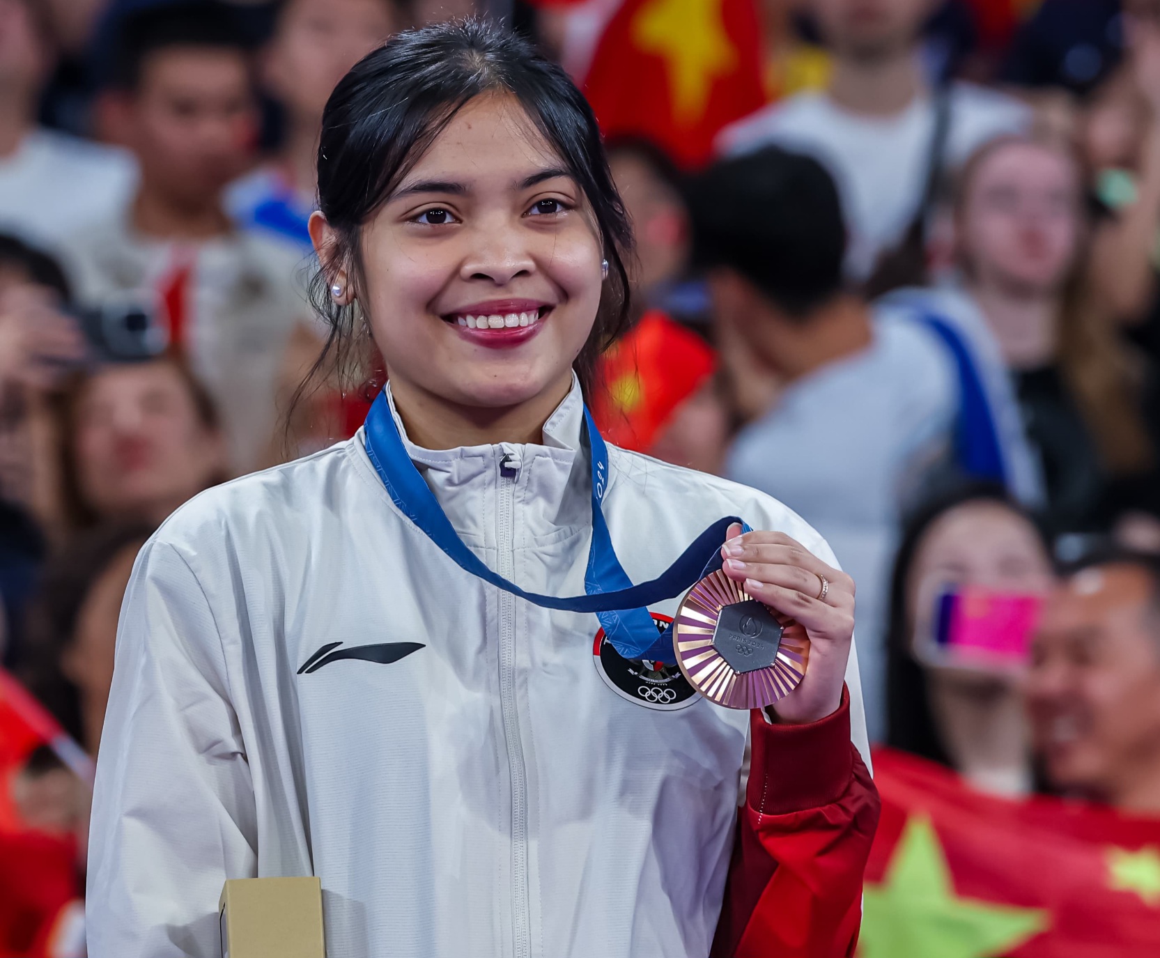 gregoria mariska tunjung saat meninjukkan medali perunggu yang diraihnya di olimpiade paris 2024-pbsi-