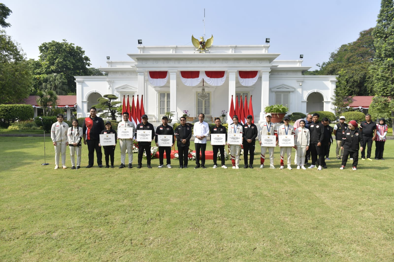 Presiden Jokowi melakukan sesi foto dengan para periah bonus di Istana Merdeka Jakarta-kemenpora-