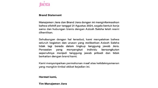bacakoran.co - baru-baru ini tim jiera official mengeluarkan statemen di akun x mereka @jieraofficial tentang pemberhentian azizah salsha sebagai ceo dari brand jiera official.