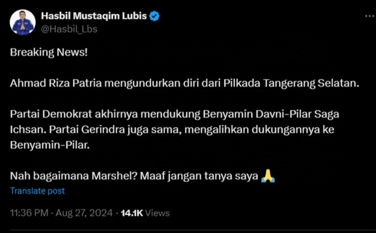 Hasbil Mustaqim Lubis sampaikan kabar Ahmad Riza Patria Mundur dari Pilkada Tangsel 2024--X/Hasbil_Lbs