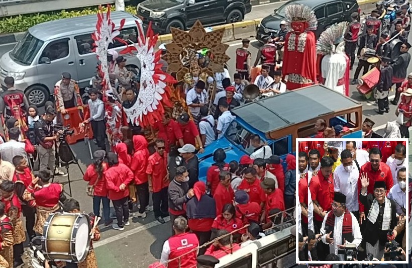 Pasangan Pramono - Rano Karno daftar Pilgub Jakarta 2024 dari PDIP, keduanya tiba di KPU Jakarta naik opelet si doel dan diiringi seni budaya betawi.--istimewa