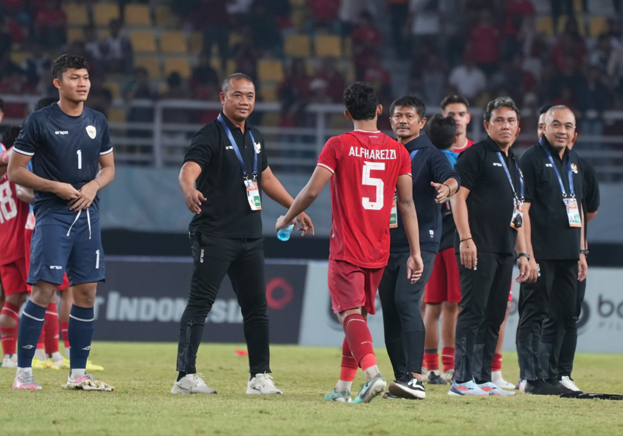 pelatih indra sjafri saat meyambut pemainnya usai pertandingan di asean u-19 boys championship-pssi-