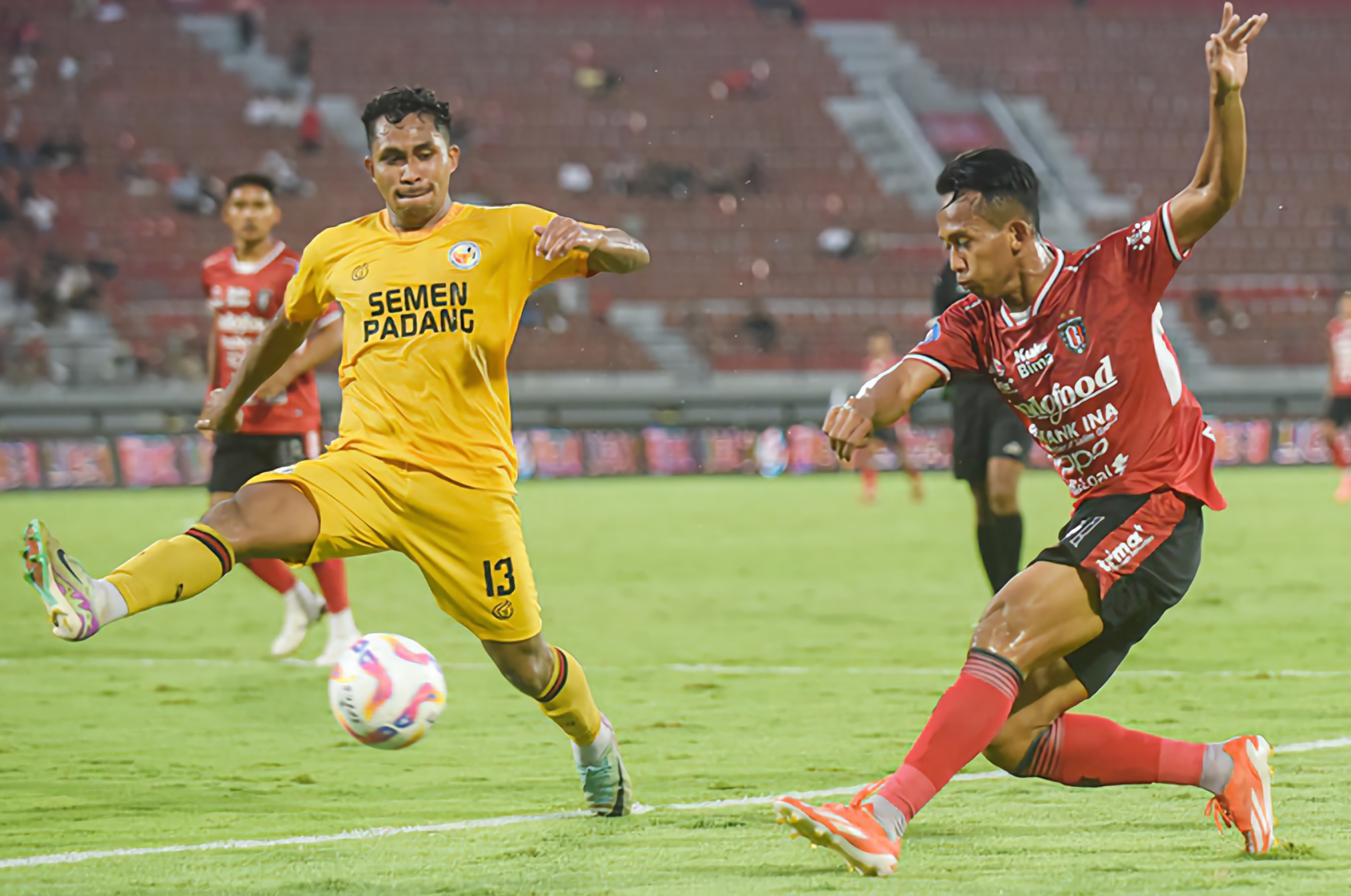 pemain semen padang saat menganggu pergerakan pemain bali united -lib-