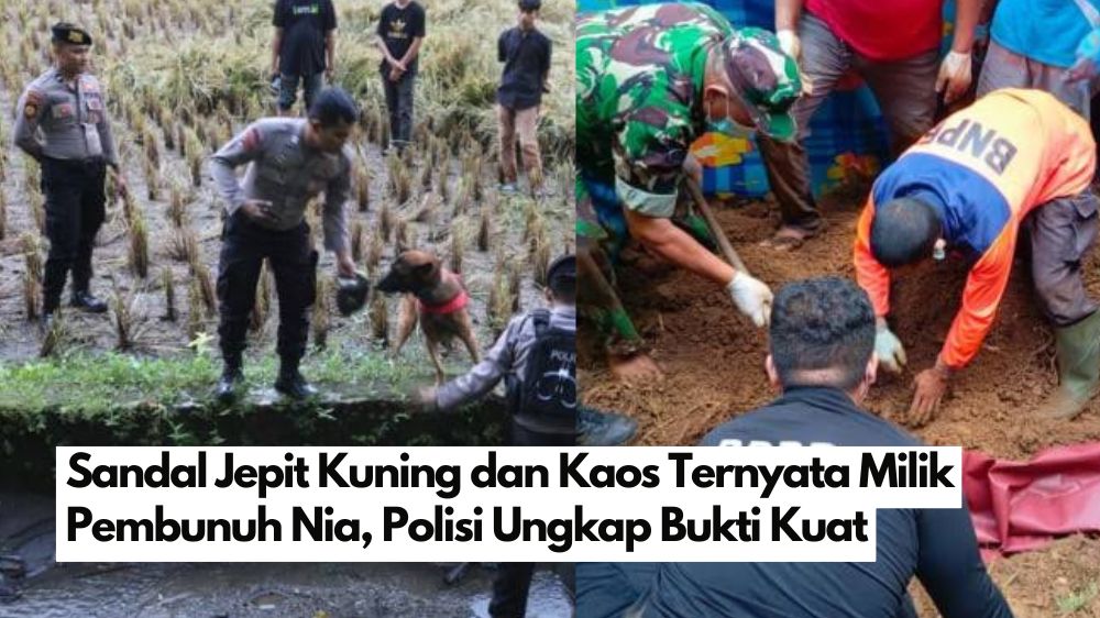 sandal jepit berwarna putih-kuning serta kaos polo dengan kombinasi warna hitam, kuning, putih, dan abu-abu diamankan dari lokasi penemuan jasad nia.