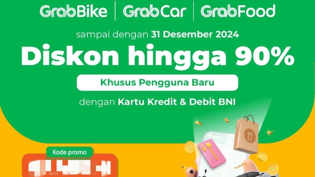 diskon 90% hingga rp 9.000 dengan kode grab bike dan car untuk pengguna baru 1 kali pemesanan berakhir 31/12/2024