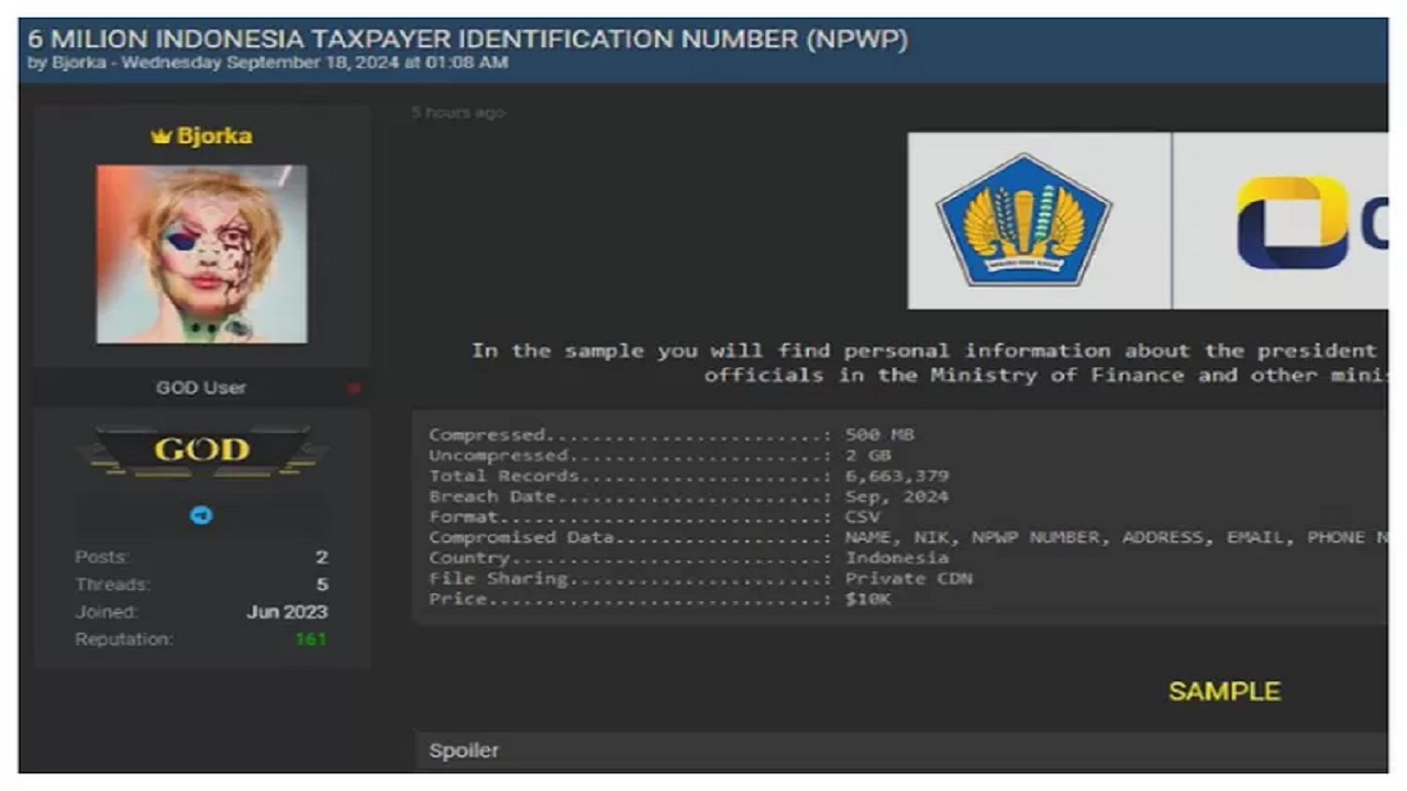 Dimana dalam forum tersebut berisi 6 juta data NPWP yang diperjualbelikan dalam situs secgron oleh akun bernama Bjorka pada 18 September 2024.