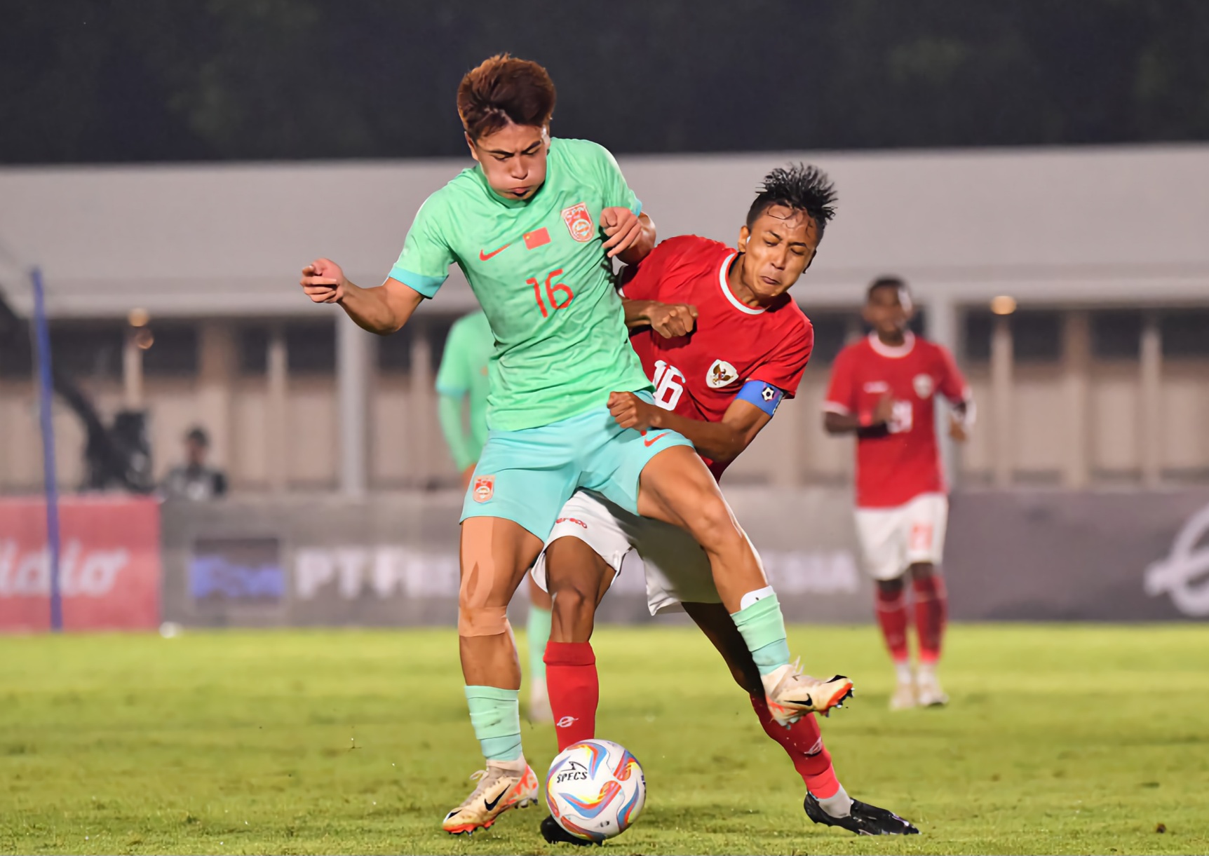 tony firmansyah saat berebut bola dengan pemain china dalam uji coba di stadion madya senayan-pssi-