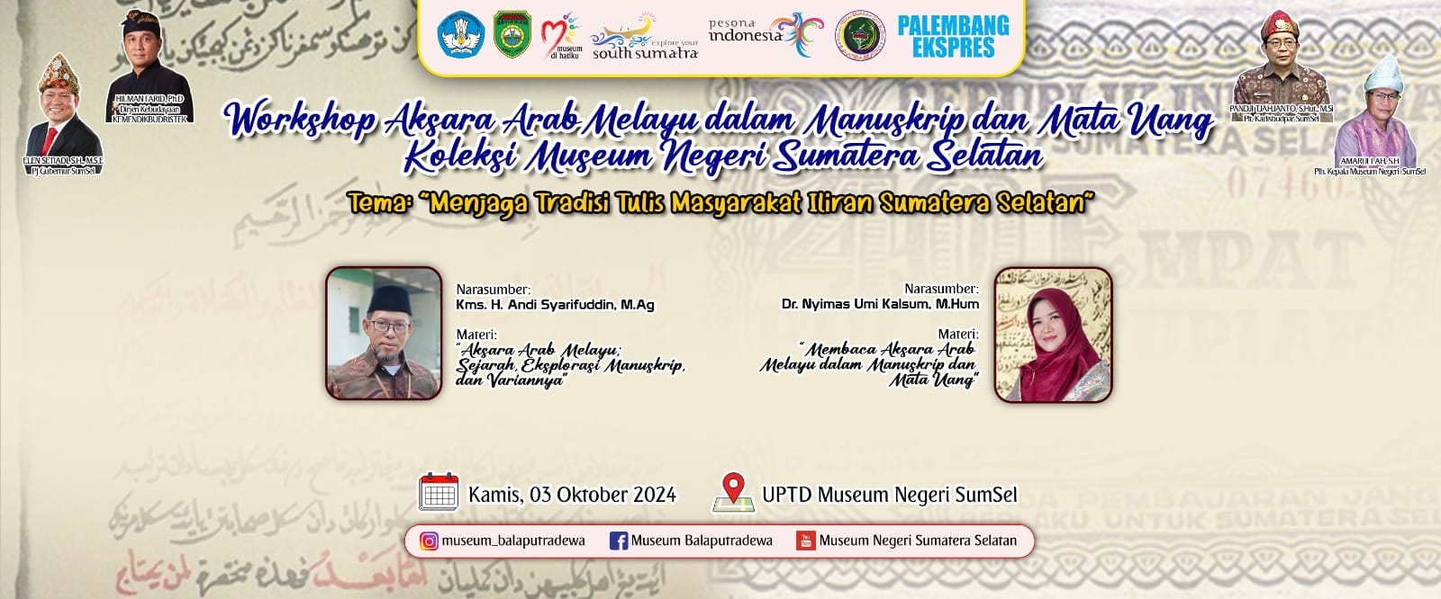 3. Work Shop Aksara Arab Melayu dalam Manuskrip dan Mata Uang Koleksi Museum Negeri Sumsel dengan narasumber Dr Hj Nyimas Umi Kalsum SAg MHum dan Kms H Andi Syarifudin SAg MAg yang digelar pada 3 Oktober 2024