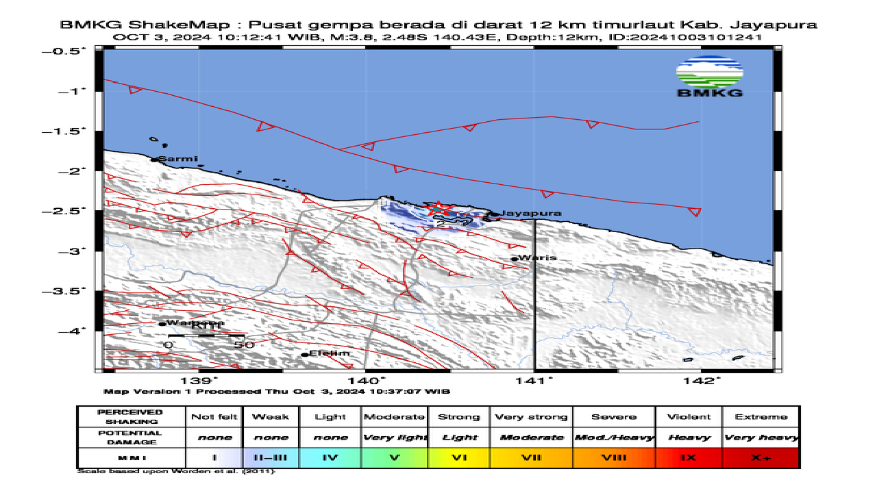 bacakoran.co -  pada rabu, 3 oktober 2024, sekitar pukul 10:12 wit, gempa bumi berkekuatan magnitudo 3,8 mengguncang wilayah kabupaten jayapura dan sekitarnya.