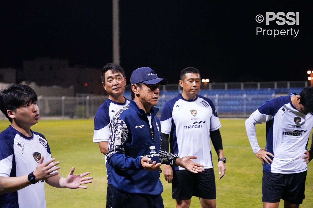 shin tae yong saat berikan arahan ke pemain di sesi latihan di bahrain -pssi-