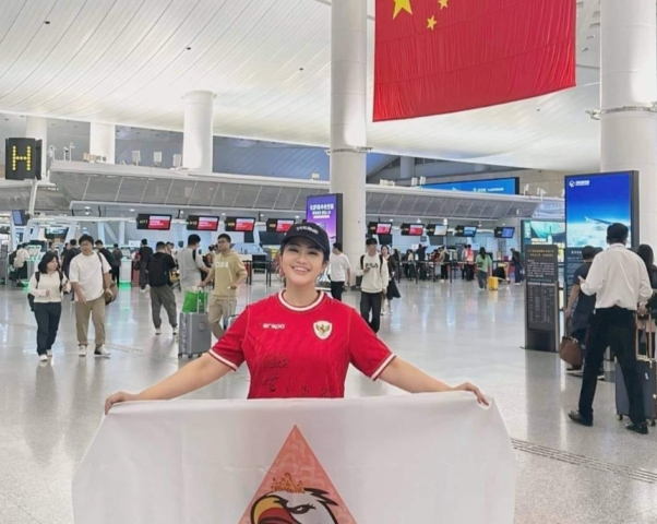 Dengan mengenakan jersey timnas Indonesia berwarna merah, memakai topi warna hitam, Fitri Carlina lansung membentangkan logo Garuda sebagai mascot utama Timnas Indonesia saat turun di bandara Internasional kota Beijing.