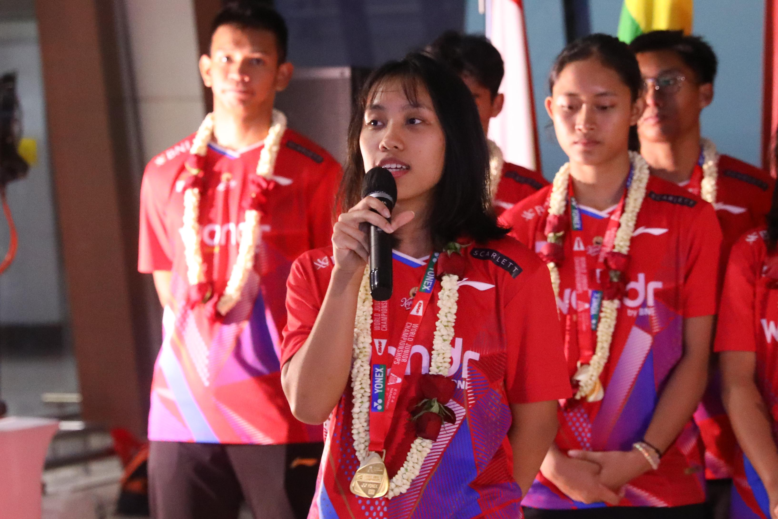 kapten tim mutiara ayu puspitasari saat wakili atlet lainnya memberikan sambutan di bandara soekarno-hatta-pbsi-