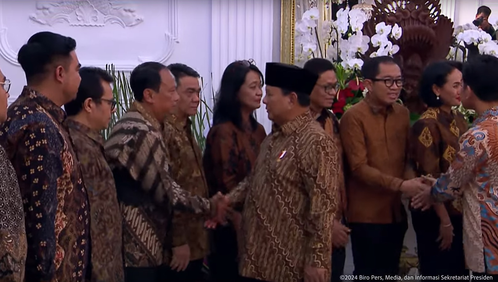 Presiden Prabowo Subianto salami para menteri usai pengumuman susunan Kabinet Merah Putih di Istana Merdeka.--tangkapan layar @sekretariat presiden/youtube