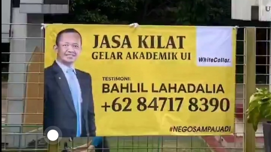 "jasa kilat gelar akademik ui tesimoni bahlil lahadalia +62 84717 8390," tulis di dalam spanduk tersebut.