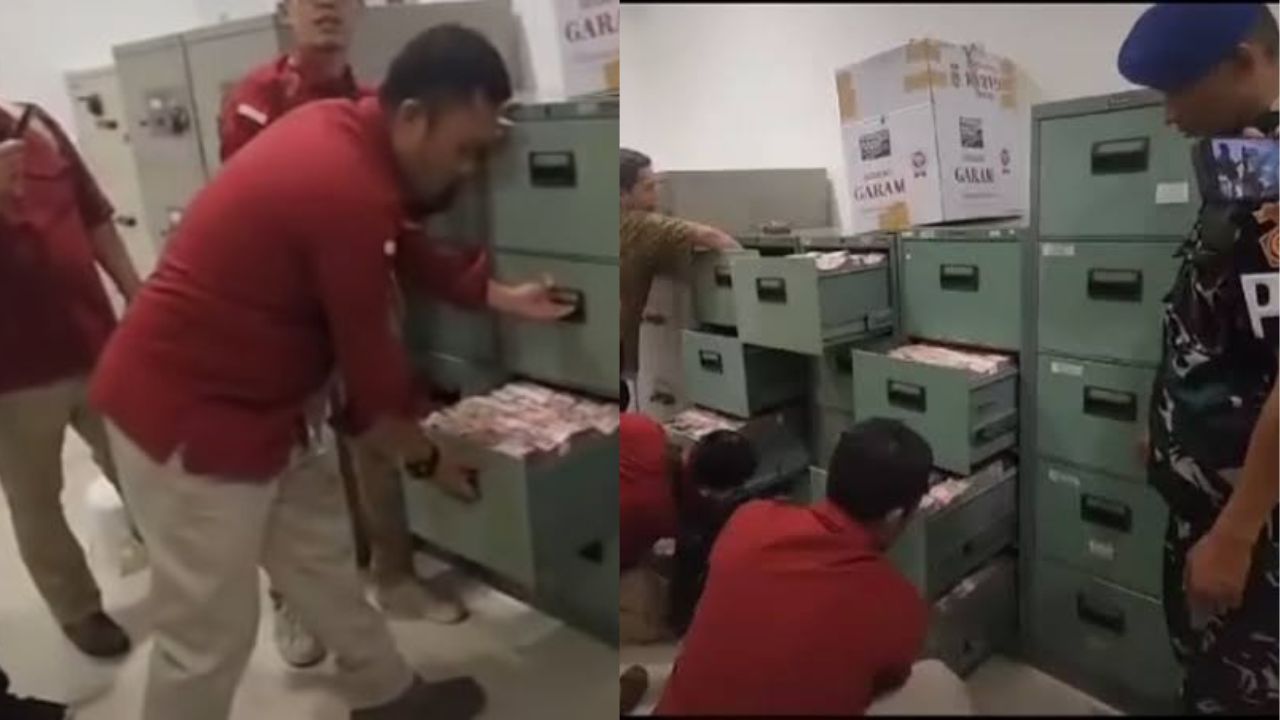 dalam video yang beredar tersebut, terlihat petugas menemukan tumpukan uang di sebuah lemari.