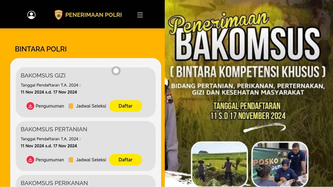 BACAKORAN.CO - Pendaftaran untuk Bintara Kompetensi Khusus (Bakomsus) Polri di bidang Pertanian, Perikanan, Peternakan, Gizi dan Kesehatan Masyarakat telah dibuka mulai hari Senin, 11 November 2024.