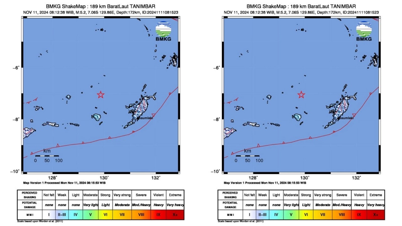 BACAKORAN.CO - Info terkini pada Senin, 11 November 2024 terjadi Gempa bumi dengan kekuatan magnitudo 5,2 terjadi di wilayah Indonesia bagian timur, tepatnya di sekitar 189 kilometer barat laut Tanimbar, pada pukul 08.12 WIB pagi tadi.
