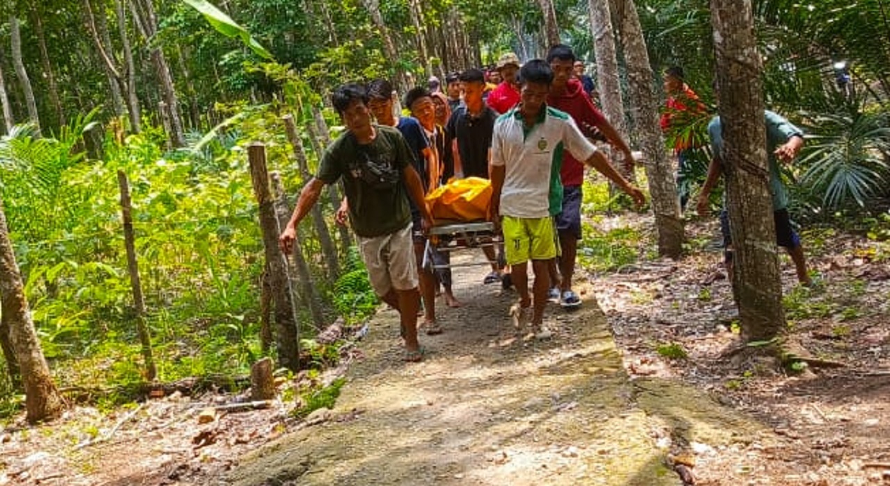 Dia di temukan tewas dengan dalam kondisi tergantung dengan leher terjerat tali yang diikatkan ke dahan pohon karet.