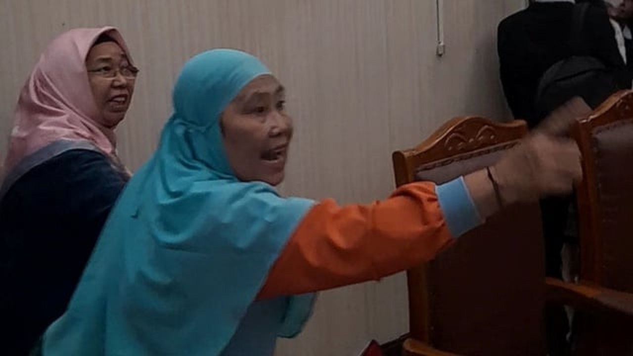 "dasar nggak tahu malu, nggak tahu malu," teriak simpatisan yang tak tiketahui namanya, sambil menunjuk para jaksa yang masih berkumpul dalam ruang sidang.