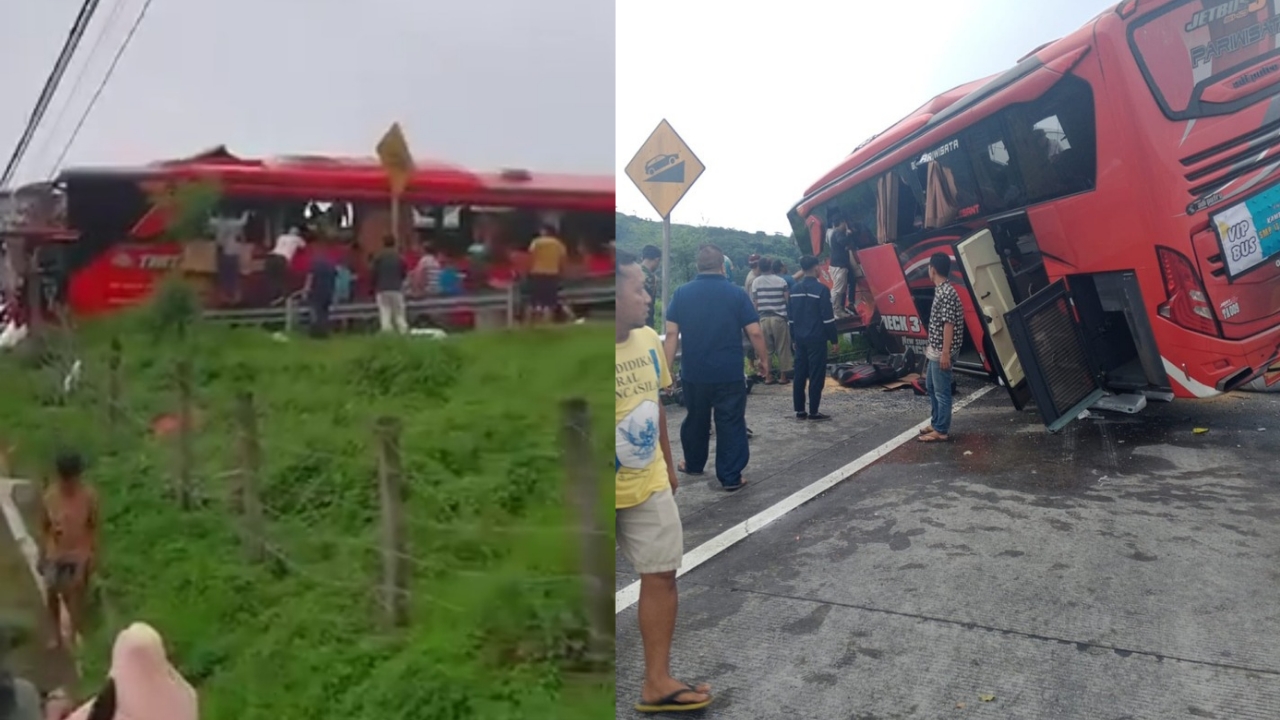 hal ini juga di unggah oleh akun di x @yusufgunawan dan memperlihatkan kondisi di tkp, yang memperlihatkan kondisi bus yang miring karena tabrakan tersebut.