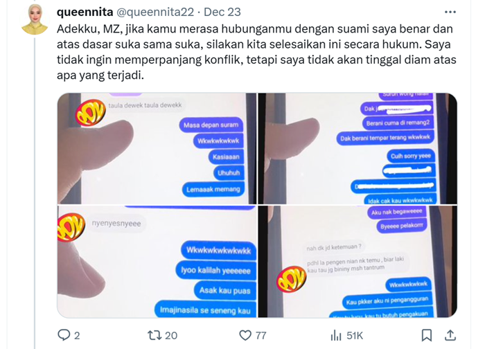 astaga, istri mana yang gak kesel, kecewa, sedih, marah saat tau suaminya selingkuh beberapa kali dan lakukan adegan romantis sampai cek in hotel, mungkin akan seperti ini reaksi netizen dan orang-orang menanggapi chat mariza zulviani.