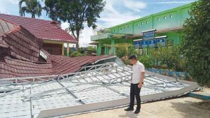 MUARA ENIM – Setelah diterjang angin kencang, Kantor Desa Batu Surau, Kecamatan Semende Darat Tengah (SDT), Kabupaten Muara Enim, terbang terangkat disapu oleh angin puting beliung. Meski tidak ada korban jiwa dalam kejadian itu, namun kerugian materil dipastikan puluhan juta rupiah. Kejadiannnya Selasa (7/2) sekitar pukul 16.00 WIB. Dari informasi yang berhasil dihimpun, Kamis (9/2) bahwa kejadian tersebut berawal ada angin kencang disertai cuaca ekstrem melanda di wilayah Semende tepatnya di Desa Batu Surau. Sekitar pukul 16.00 WIB, tiba-tiba angin puting beliung datang dan merusak, serta mengangkat atap Kantor Pemerintahan Desa Batu Surau dan jatuh dihalaman Kantor Pemerintahan Desa. Serta sebagian menimpa atap SDN 06 Semende Darat Tengah (SDT), yang kebetulan berada satu komplek dengan kantor Pemerintahan Desa Batu Surau.“Beruntung pada saat kejadian, kantor desa sudah tutup dan anak-anak sekolah sudah pulang. Sehingga tidak ada korban jiwa hanya kerugian material saja,” ujar Kepala Desa Batu Surau, M Ridwan.