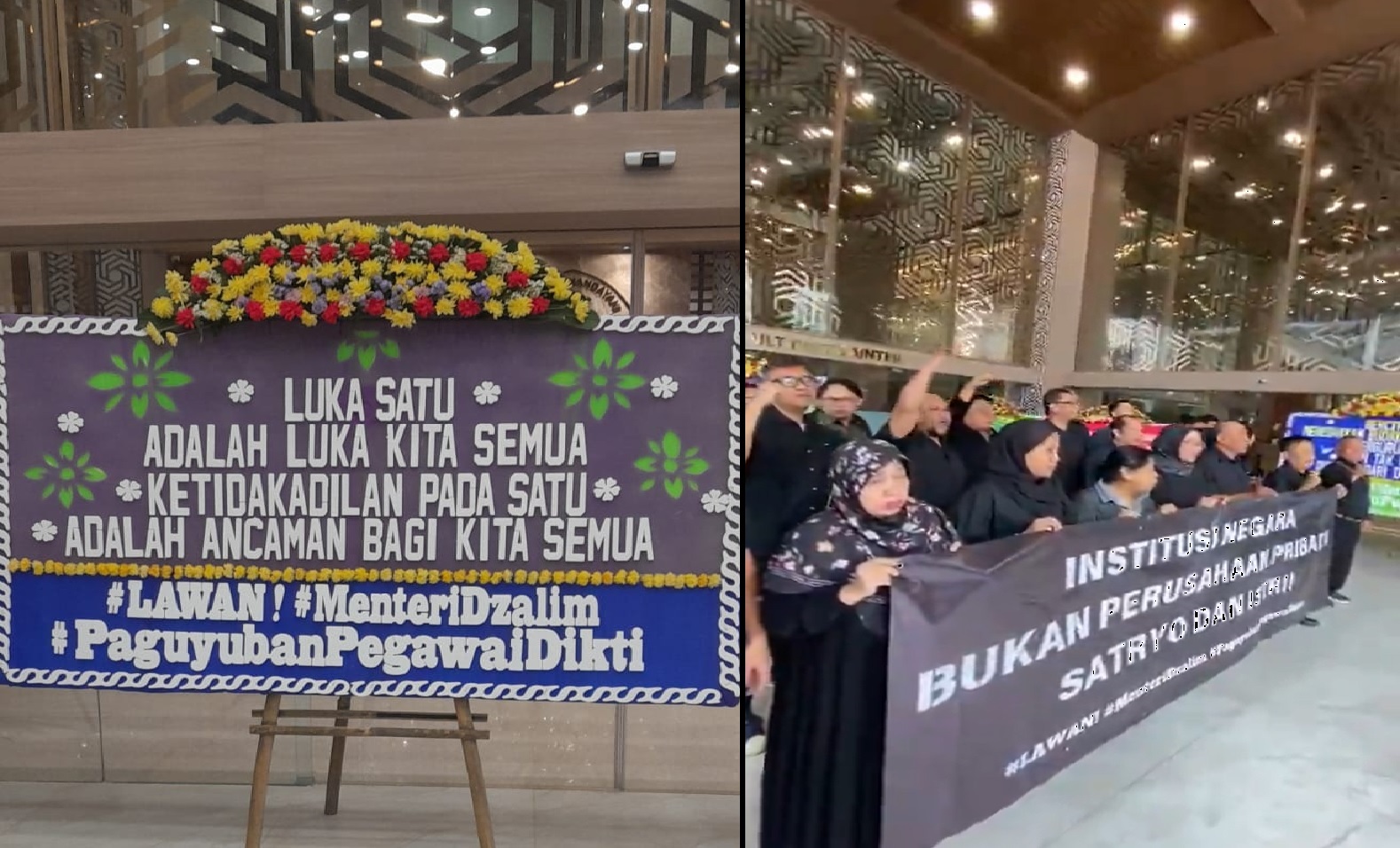 Video diduga pegawai Kemendikti viral di medsos, mereka bentangkan spanduk bertuliskan bukan perusahaan pribadi Satryo dan istri dengan tagar MenteriDzalim.--x/istimewa