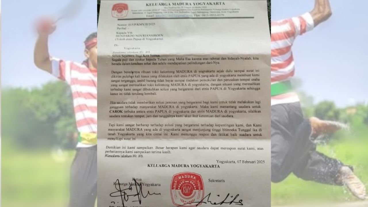 “jika saudara tidak bisa memberikan solusi jaminan yang bergaransi bagi kami untuk tidak melakukan lagi gangguan terhadap masyarakat madura di yogyakarta, maka kami menantang saudara untuk carok terbuka antara etnis papua di yogyakarta dan etnis madura di yogyakartayogyakarta, silahkan saudara tentukan tempat jam dan tanggalnya kami akan ikut ketentuan dari saudara,” tegas isi surat fkmy.
