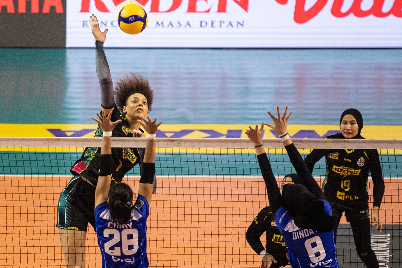 Pemain Jakarta Electric PLN saat melepaskan smes keras dalam dalam perjuangan ke final four Proliga 2025-pbvsi-