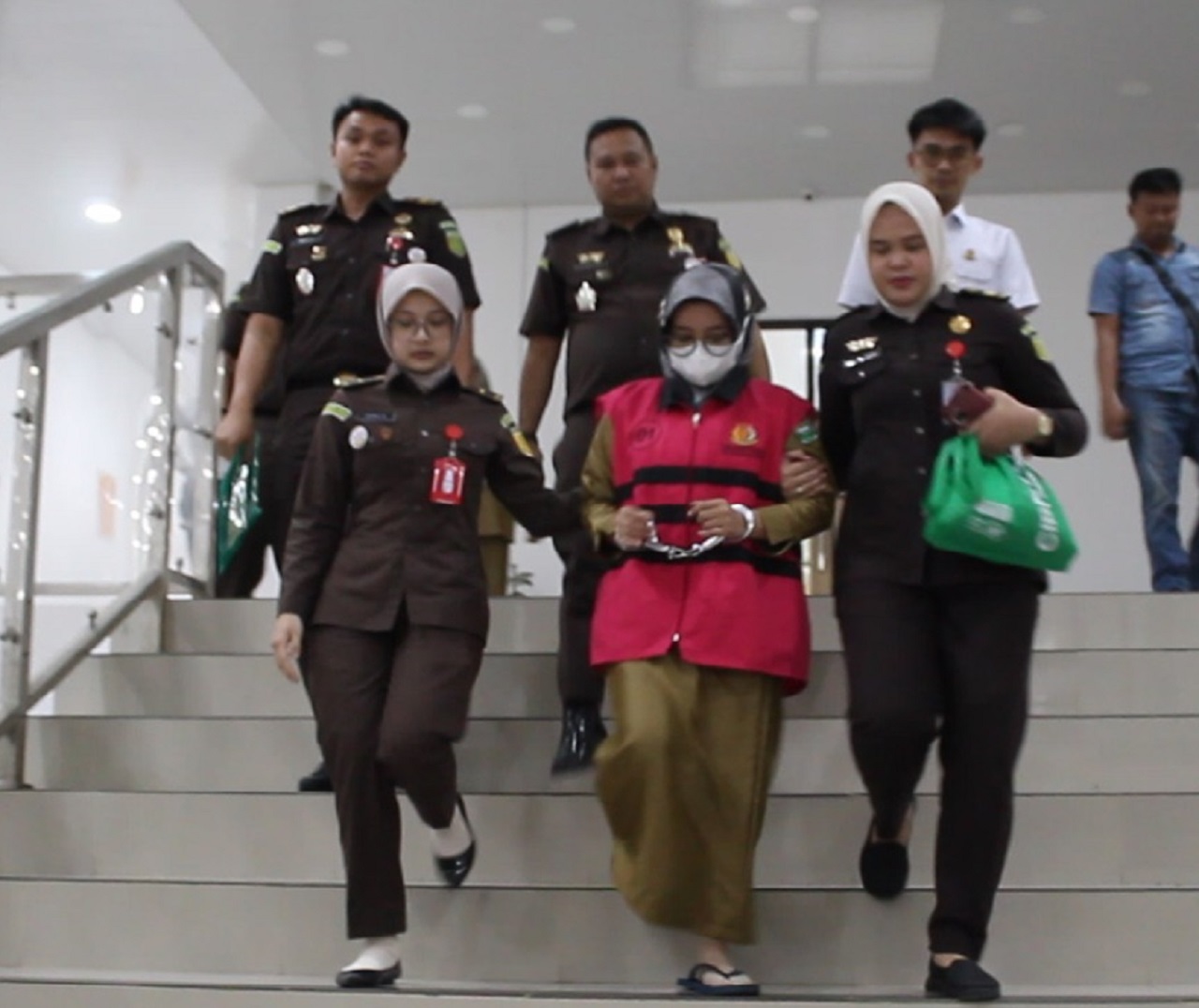 Setelah menjalani pemeriksaan, Rasti Oktaviani dengan tangan di borgol dan mengenakan rompi tahanan digiring petugas untuk dititipkan penahanannya di Lembaga Pemasyarakatan (Lapas) Kelas II B Muara Enim.
