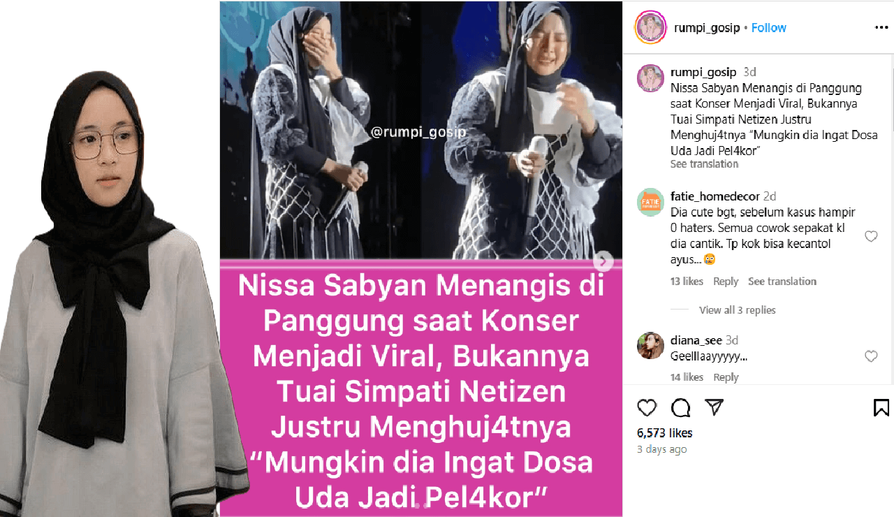 tangisan nissa sabyan sampai viral dan ramai jadi perbincangan di media sosial, khususnya pada akun instagram @rumpi_gosip yang mencapai 6,573 likes saat berita ini dibuat.