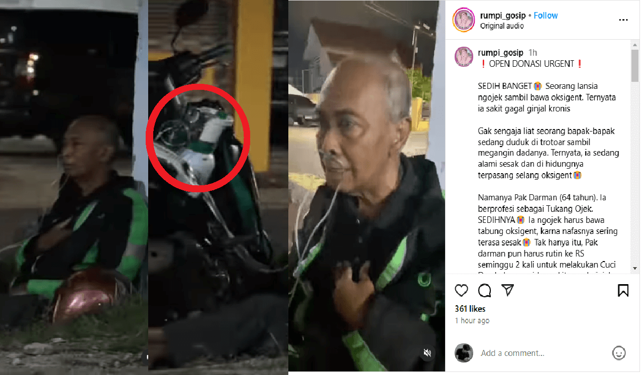 Dalam unggahan tersebut, Pak Darman terlihat duduk di trotoar sambil memegangi dadanya, dengan selang oksigen terpasang di hidungnya.