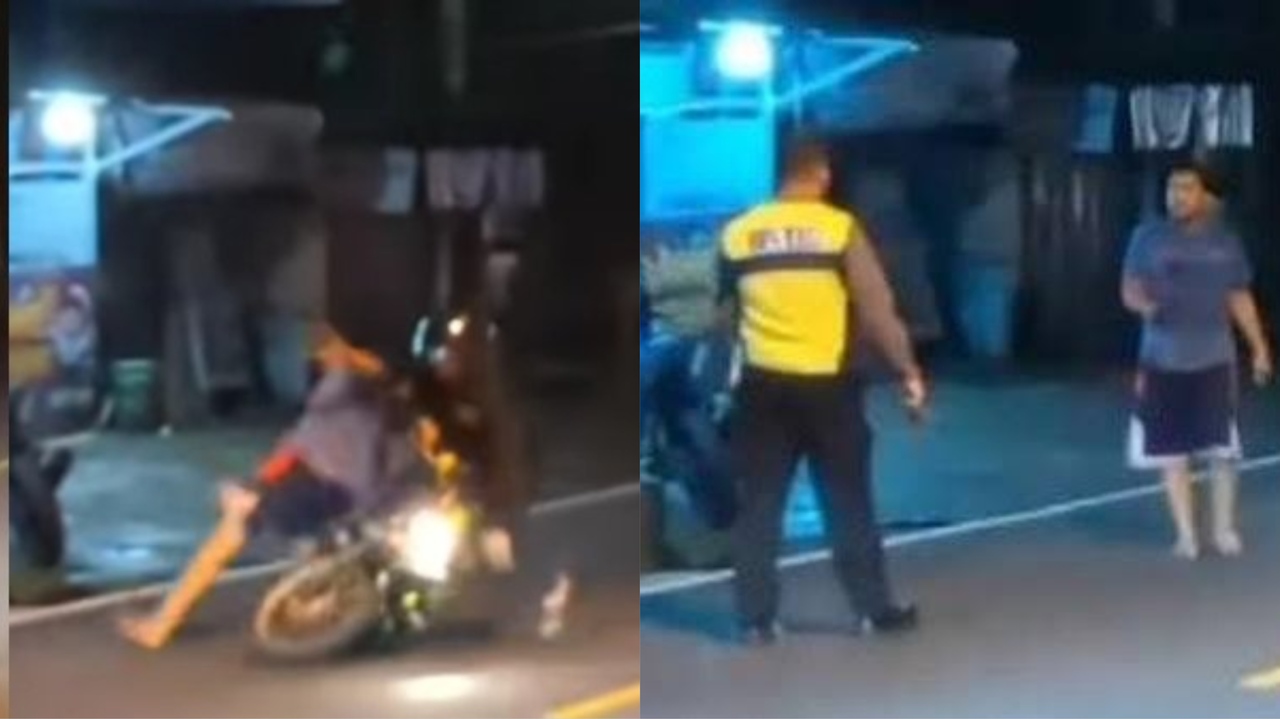 Dengan keberanian yang luar biasa, pengendara ini menabrakkan motornya ke arah pria tersebut membuatnya terjatuh dan tidak berdaya.