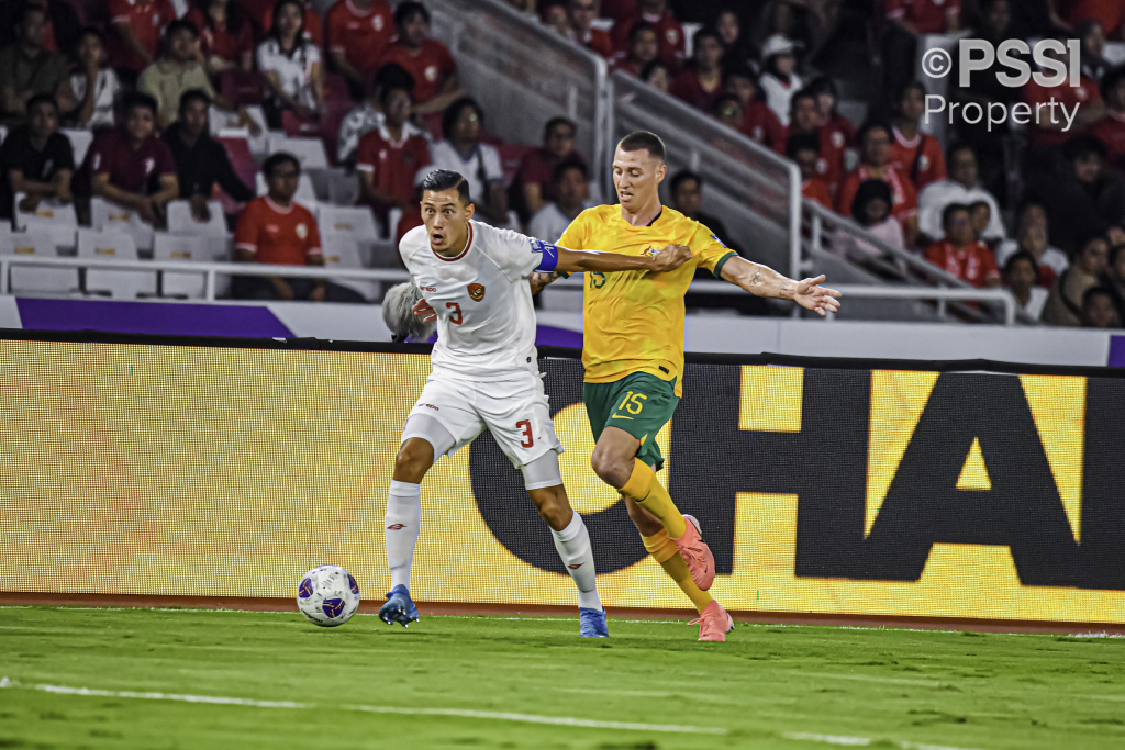 Jay Idzes saat kawal Pemain Australia pada pertemuan pertama di SUGBK Senayan -pssi-