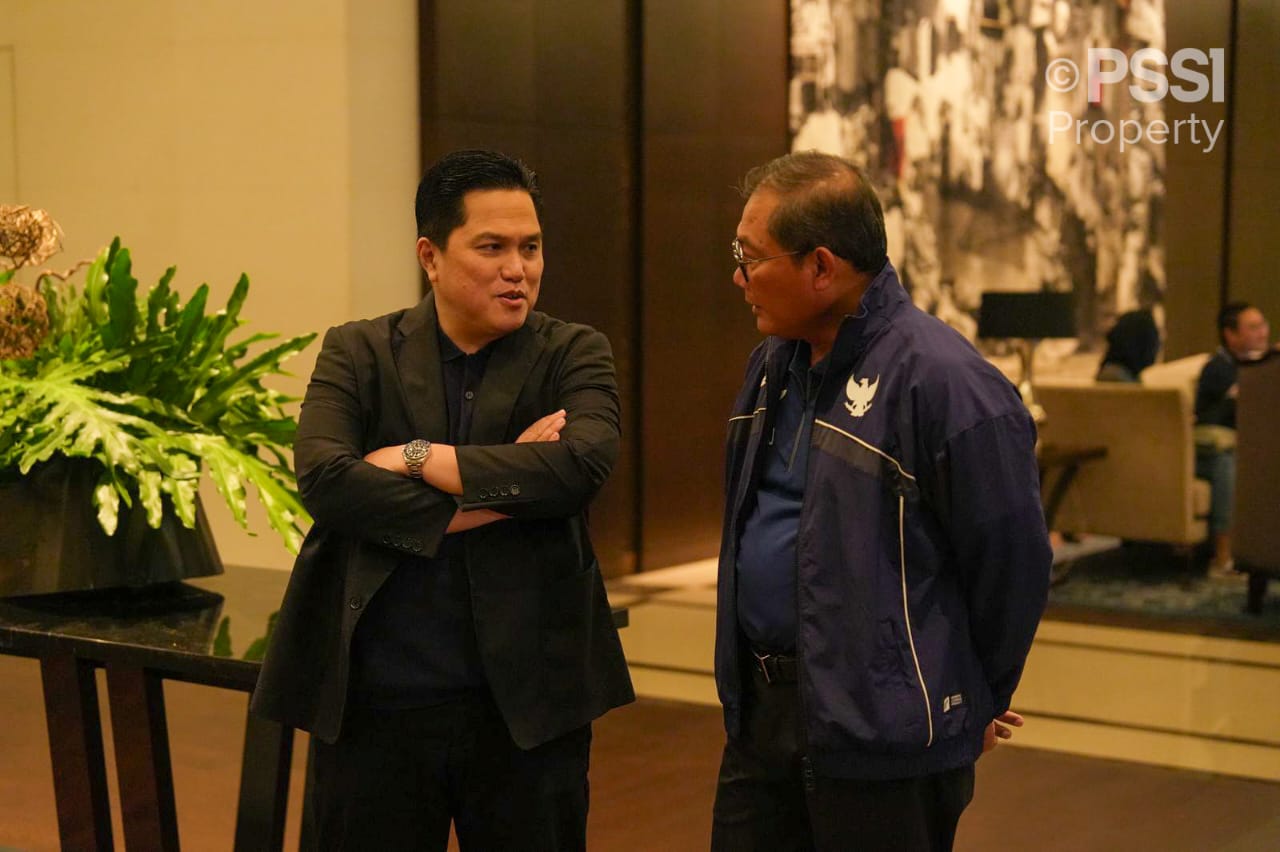 manajer timnas indonesia sumardji saat berbincang dengan ketum pssi erick thohir di sela-sela pelepasan pemain timnas indonesia -pssi-