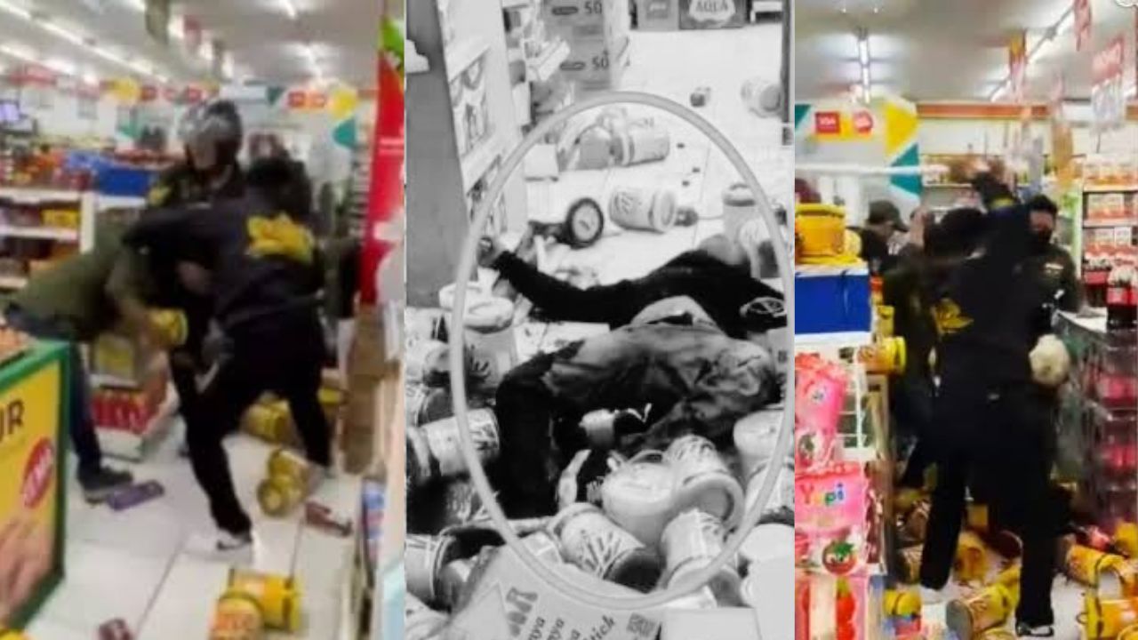 barang-barang minimarket berserakan di lantai, bercampur dengan darah korban yang terluka parah.