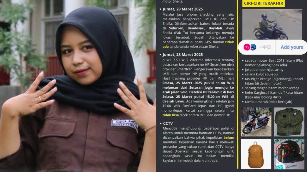 Dilansir Bacakoran.co dari akun X @mwv_mystic, Sheila berangkat dari Yogjakarta menggunakan motor sendirian dan saat itulah terakhir ia terlihat kemudian tidak bisa dihubungi lagi atau lost contact.