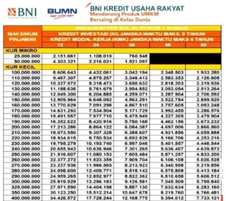 2. kur mikro: pinjaman mulai dari rp10 juta hingga rp50 juta, dengan tenor hingga 60 bulan dan bunga 6% per tahun.