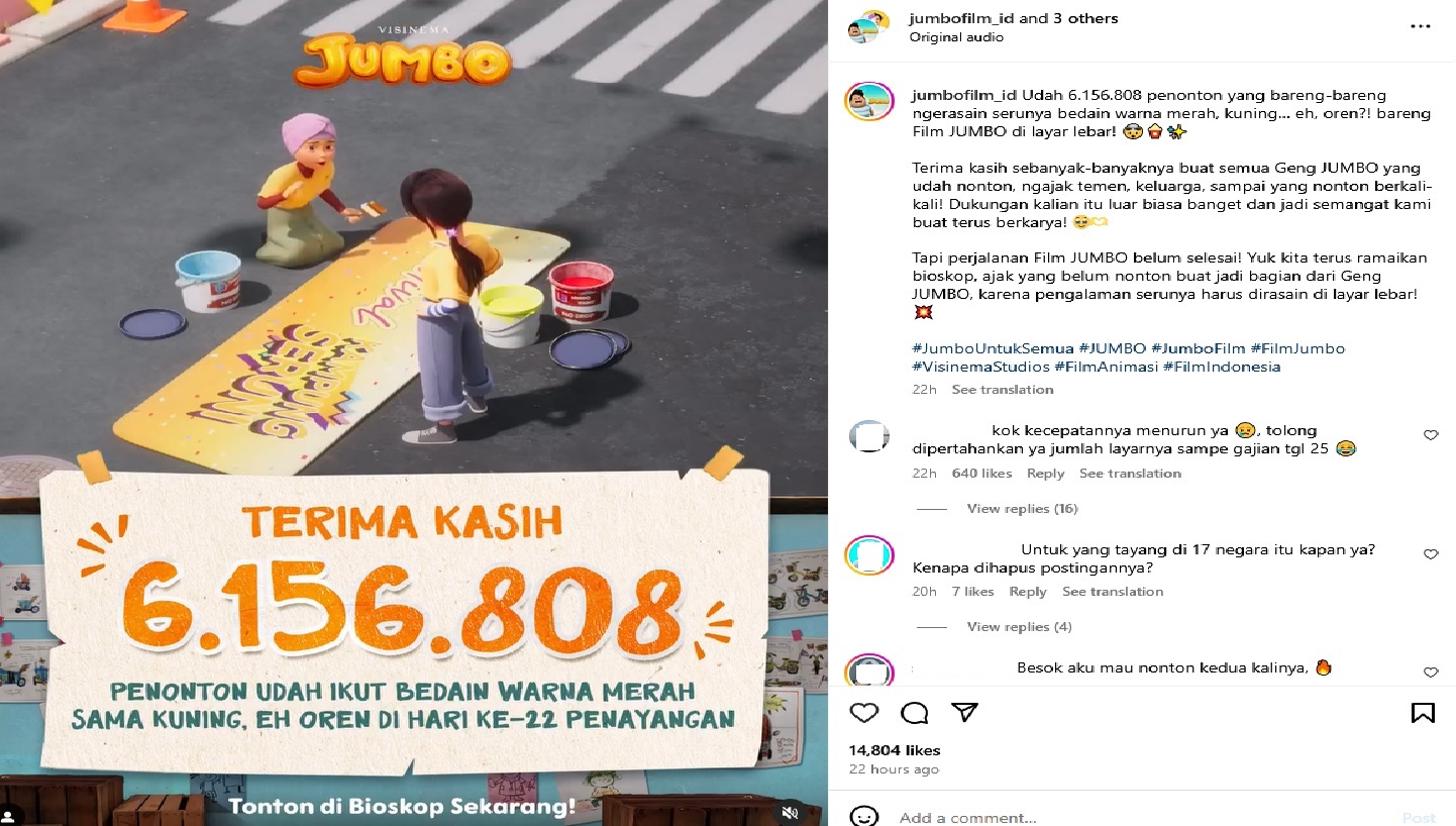 “TERIMA KASIH 6.156.000 PENONTON SUDAH IKUT BEDAIN WARNA MERAH SAMA KUNING, EH OREN DI HARI KE-22 PENAYANGAN!,” tulis akun resmi Instagram @visinemaid.