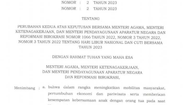 Perubahan jadwal cuti bersama tahun 2023 ini mengubah Lampiran Keputusan Bersama Menteri Agama