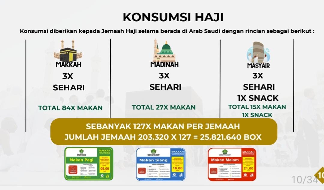 Lalu berkaitan dengan layanan konsumsi, Muchlis M Hanafi menjelaskan bahwa Kementerian Agama sudah bekerja sama dengan 55 perusahaan katering. Mereka akan menyiapkan 84 kali makan bagi jamaah selama di Makkah dan 15 kali makan saat puncak haji di Armina.