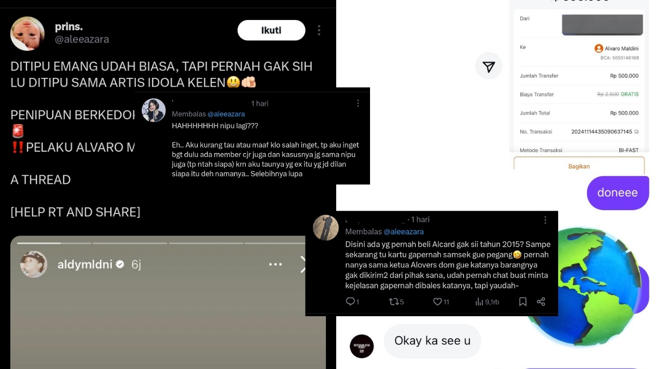 "Ditipu emang udah biasaz tapi pernah gak sih lu ditipu sama artis idola Kelen. Penipuan Berkedok event dinner bareng fans!!. Pelaku Alvaro Maldini Siregar/Aldy CJR" cuit akun tersebut, Dilansir Bacakoran.co dari akun X @aleeazara, Minggu (11/5/2025).