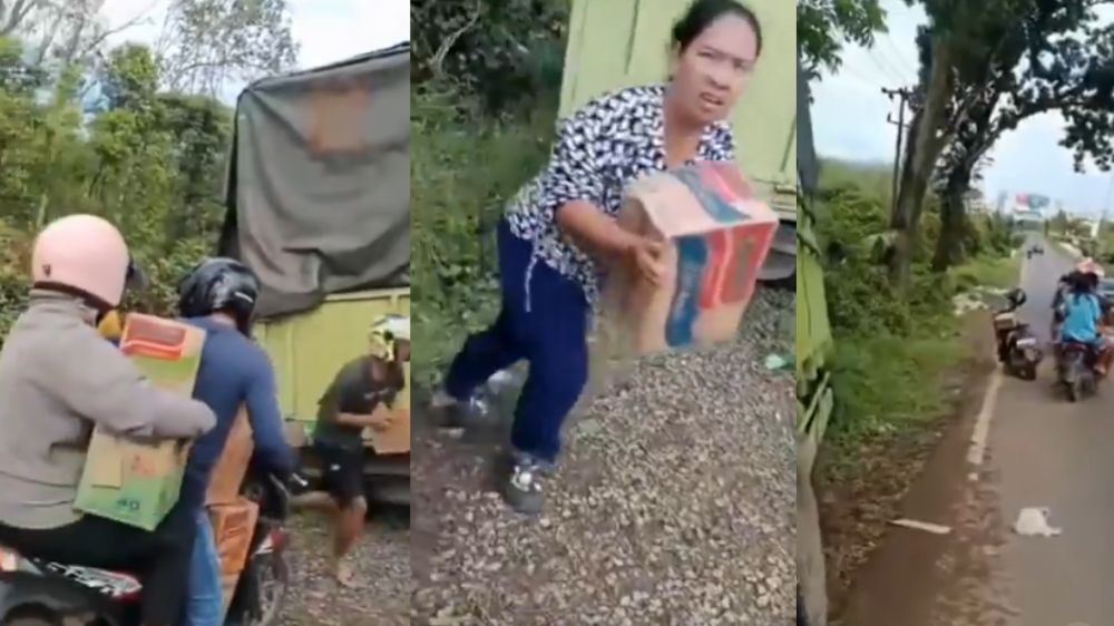 Potongan video truk muatan mie instan di sumsel dijarah warga saat kecelakaan/Bacakoran.co--X dhemit_is_back
